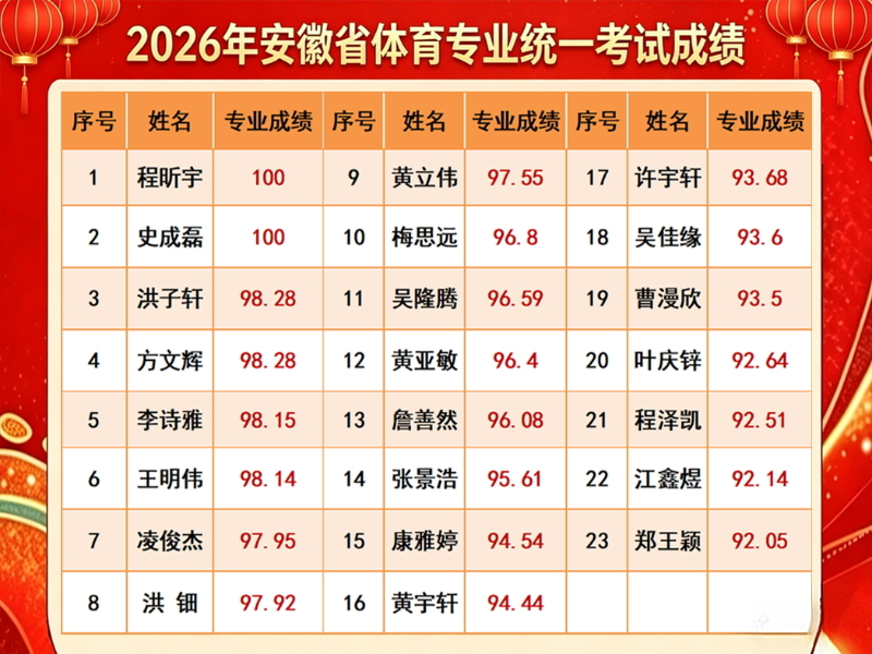 春风传捷报,体坛谱华章。近日,2026年安徽省体育专业统一考试成绩正式公布,歙县二中体育学子不负众望,交出了一份令人欣慰的答卷:全校23名参考考生全员突破92分,均分高达95.95分,其中程昕宇、史成磊两位同学更是以完美发挥斩获100分满分,97分以上达7人,创下学校体育高考历史新高!这一突破性成绩的背后,是学校深耕“体育特色”办学、精准落实“导-师-制+”育人模式的生动实践,更是全体体育导师与学子日夜并肩、砥砺前行的丰硕成果。