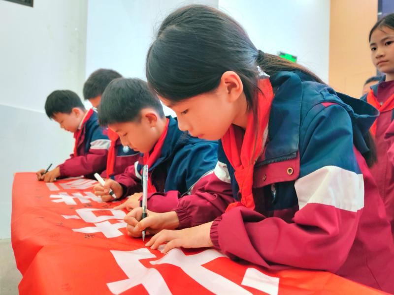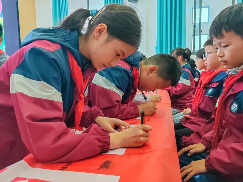 宣讲结束后,全体队员有序来到主题签名横幅前,拿起签字笔,郑重地写下自己的名字。一笔一划,不仅是名字的书写,更是一份守护地球、践行环保的庄严承诺。大家纷纷表示,会将环保理念牢记心中,把环保行动融入日常,从节约一度电、一滴水、一张纸做起,用实际行动守护绿水青山,共建美丽校园与美好家园。