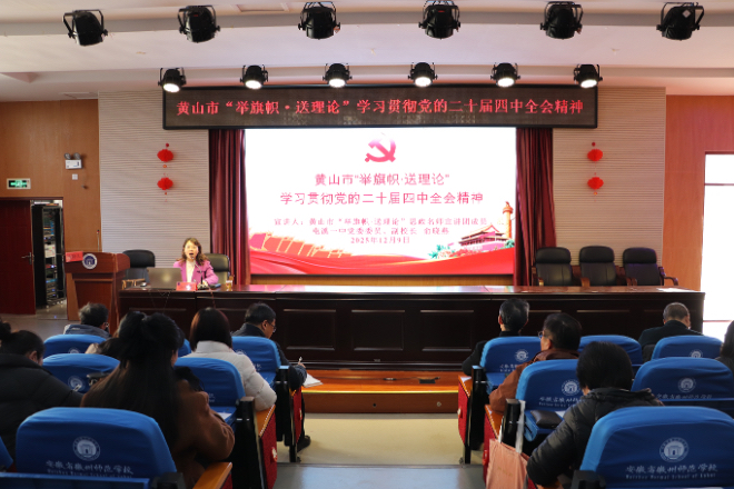 12月9日下午,黄山市“举旗帜·送理论”学习贯彻党的二十届四中全会精神的专题宣讲报告会在安徽省徽州师范学校报告厅举行。屯溪一中党委委员、副校长俞晓燕作主题宣讲,学校全体教工及各班团支书参会。