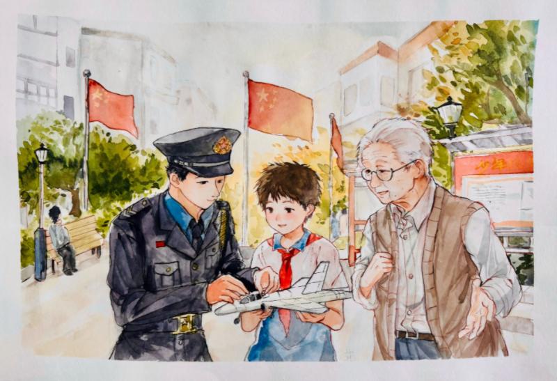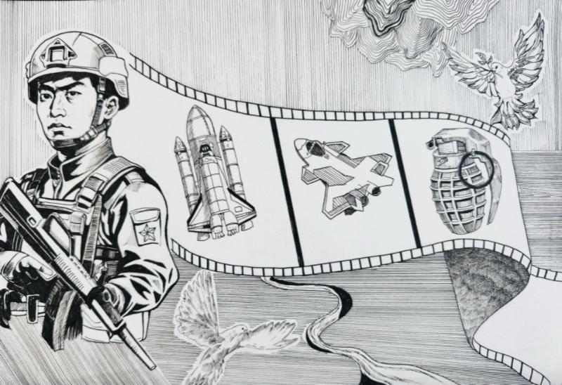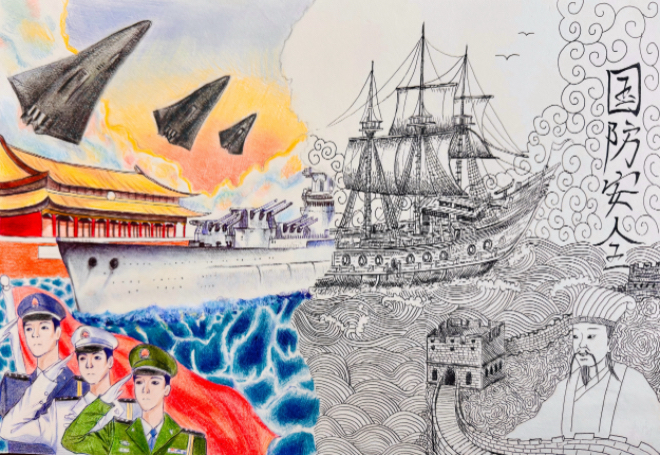 方安妮同学的《传承的目光》以独特的视角和细腻的笔触,深刻诠释了红色精神的代代相传;汪雪怡同学的《未来与和平》构思新颖,表达了青少年对强国强军与和平发展的美好憧憬;吴雨晨同学的《古今对话》则巧妙融合历史与现代元素,凸显了国防安全的永恒主题。这些作品主题鲜明、情感真挚、富有感染力,赢得了评委的充分肯定。