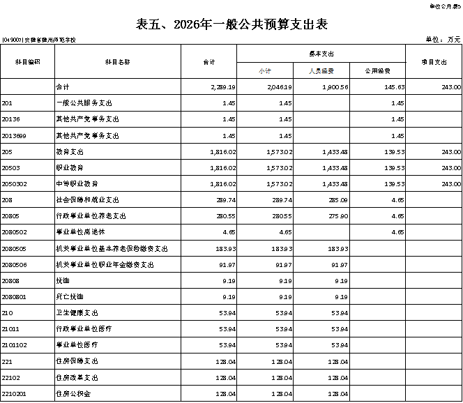 5.安徽省徽州师范学校2026年一般公共预算支出表
