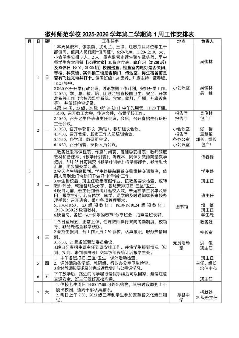 徽州师范学校2025-2026学年第二学期第1周工作安排表