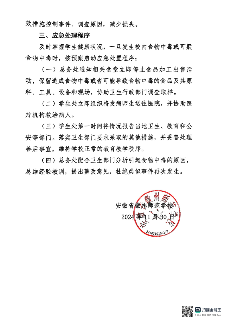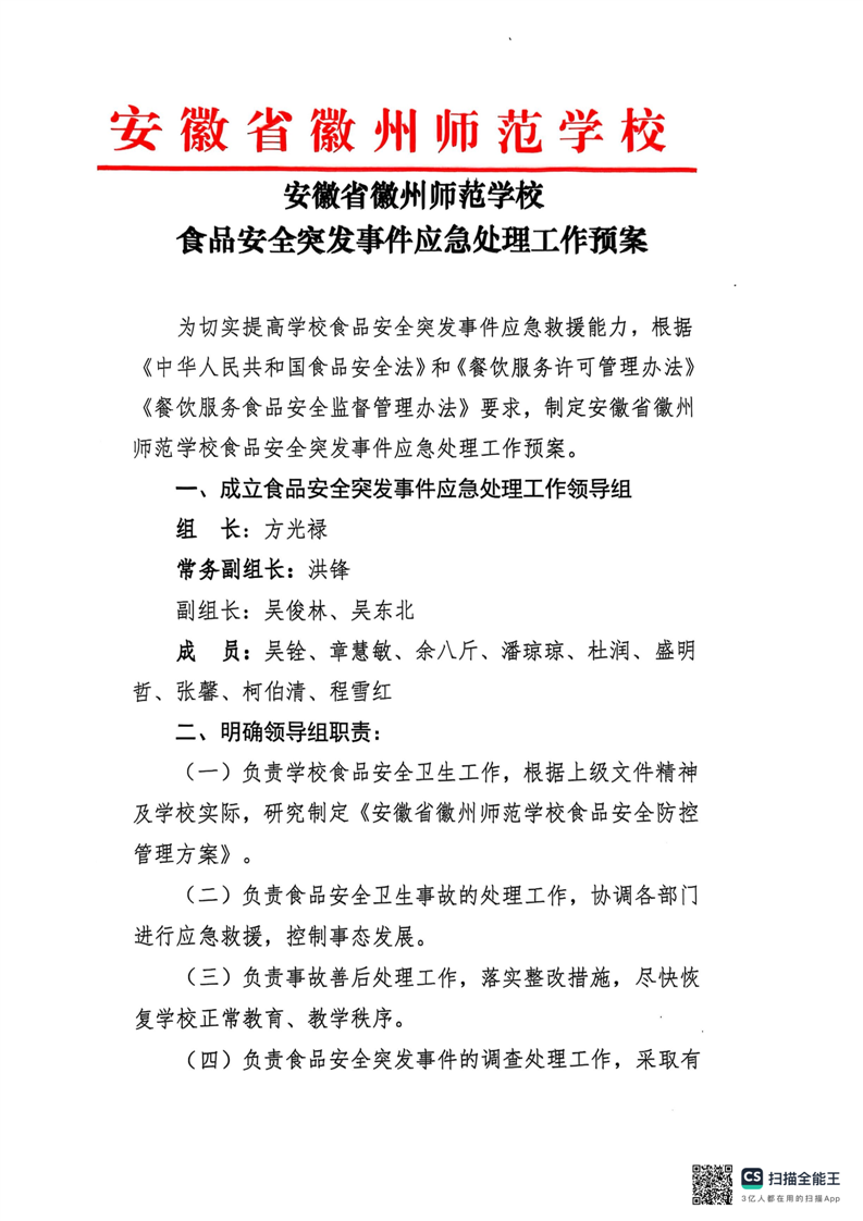 安徽省徽州师范学校食品安全突发事件应急处理工作预案