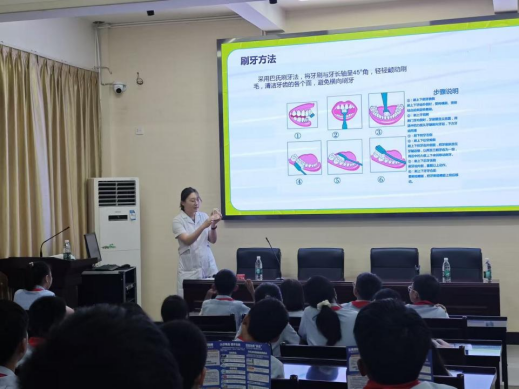 口腔健康科普环节,口腔专家通过趣味动画展示牙齿问题成因,现场示范“巴氏刷牙法”和牙线使用技巧,手把手指导学生掌握科学护齿方法,让孩子们在轻松氛围中养成良好口腔护理习惯。