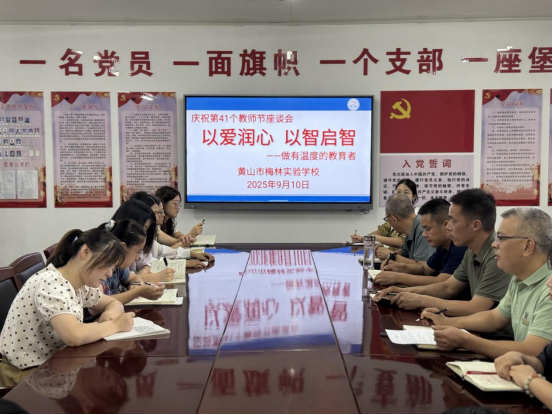 秋韵荡漾,桂子飘香。为庆祝第41个教师节,弘扬尊师重教传统,倾听教师心声,共谋学校发展,9月10日上午,黄山市梅林实验学校举办“以爱润心 以智启智”主题座谈会。学校领导班子、2024年度获奖教师及老中青教师代表共计20余人参会。座谈会由党支部专职副书记徐文利主持。