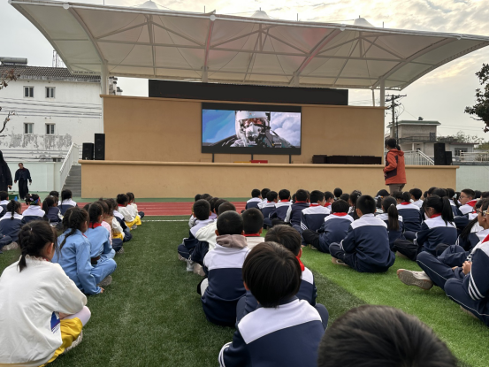 银幕上,航空英雄们不畏艰险、为国铸器的热血故事震撼人心;银幕下,红领巾与光影交相辉映,队员们时而屏息凝神,时而眼中泛起泪光。学校运动场提升改造后的主席台大彩屏,让观影体验更具沉浸感,也让英雄事迹的感染力直达人心。自“红孩子养成计划”启动以来,学校坚持以红色影片为载体,每月精选经典作品,让队员们在光影中回望峥嵘岁月、汲取奋进力量。