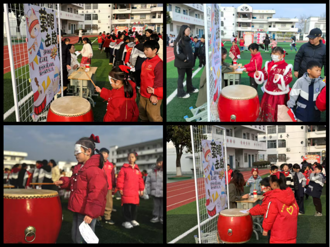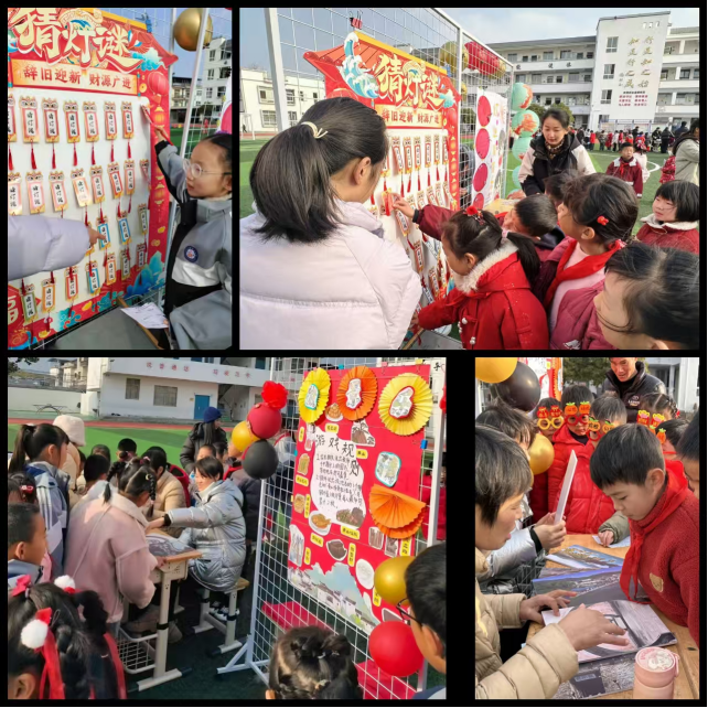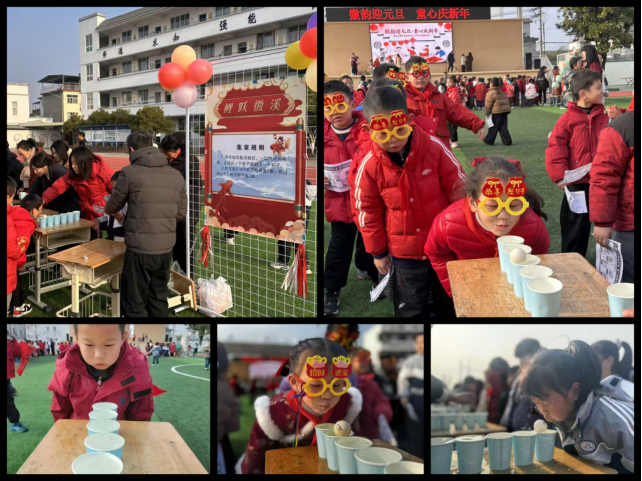 12月31日上午,校园变身欢乐海洋,“徽韵游园·童心贺岁”活动如期举行。活动按年级分时段开展,“徽娃祈福”编中国结送祝福,“鲤跃徽溪”吹乒乓球展技巧,“徽景乐猜”识地名话特色,“徽鼓传声”蒙眼敲鼓显默契,“徽墨描福”挥毫泼墨品文韵,“徽州灯谜猜猜乐”巧思解谜悟智慧。同学们手持“集福卡片”穿梭于各个关卡,家长志愿者与学生志愿者现场维护秩序、补充物料。集满5个及以上福章的同学可参与套圈兑奖,大家满载而归,欢声笑语弥漫校园。