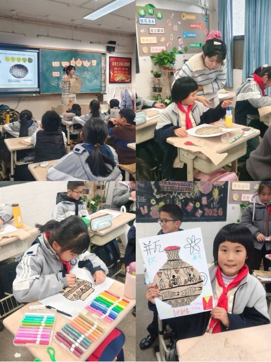 彩陶文化课程上,家长导师带着色彩斑斓的彩陶教具走进教室,从远古彩陶的起源、不同地域彩陶的纹样特点,到彩陶的绘作工序,都进行了生动讲解。在实践体验环节,孩子们在导师的指导下绘制简单的几何纹样,亲手感受彩陶纹样的乐趣,不仅沉浸式领略了中华传统文化的魅力,更在动手实践中培养了孩子们的专注力与创造力。