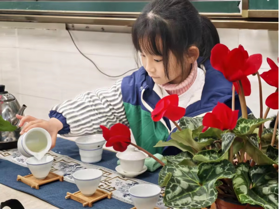 茶艺点茶课程则让孩子们近距离感受传统茶文化的雅致。家长导师身着素雅茶服,一边演示点茶的步骤,一边讲解茶叶的种类、茶具的名称和使用方法。温润的茶汤在茶盏中泛起细腻的泡沫,孩子们目不转睛地盯着导师的动作,跃跃欲试。在亲身体验环节,大家模仿着温盏、投茶、注水、击拂的动作,虽然手法略显稚嫩,却都做得有模有样。袅袅茶香萦绕教室,孩子们在一斟一饮间,学会了耐心与专注,更体会到了传统礼仪文化的内涵。
