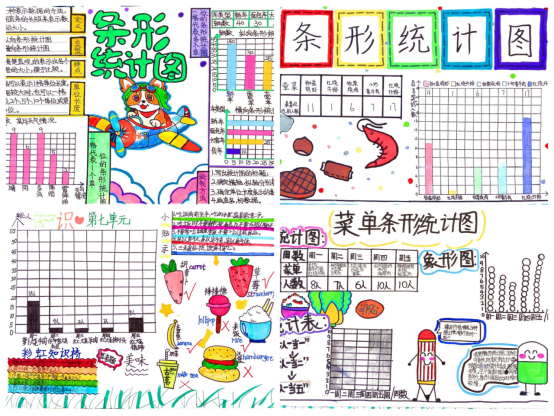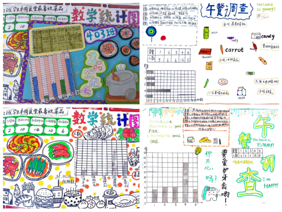 活动中,数学老师们在课堂上讲解规则、明确本周5种常见荤菜的调查范围并发放记录表,引导学生掌握“调查收集→整理数据→绘制条形统计图”的完整流程。同学们通过问卷、访谈收集班级同学菜品喜好数据,精心整理成表格后,在8k纸张上手写手绘创作小报:规范的统计图、清晰的表格、精准的数据解读,搭配美食漫画与节约粮食小贴士,每一份作品都创意十足、童趣盎然。