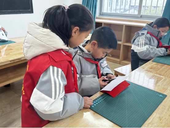 技法教学阶段,美术教师夏微现场展示剪纸技艺,导师们同步跟进,针对不同孩子的接受能力,分步拆解剪纸的核心要领,强调刻刀等工具的安全使用规范。对于基础薄弱的孩子,导师们手把手耐心指导,确保人人都能掌握基本技法。