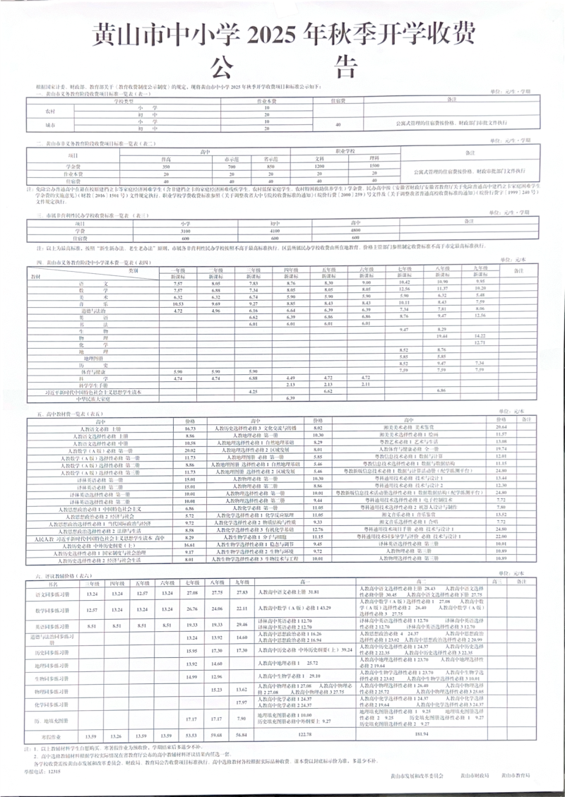 黄山市中小学2025年秋季开学收费公示