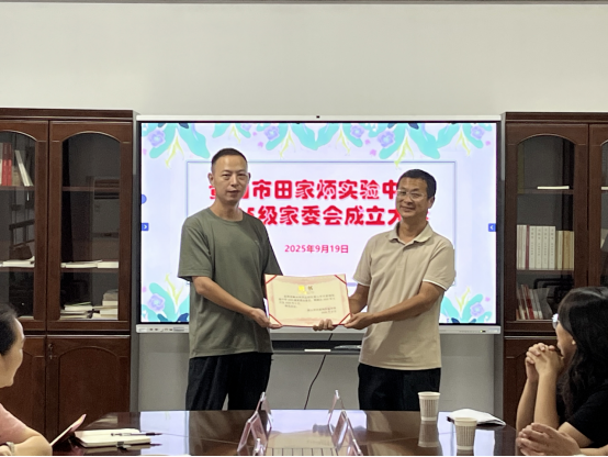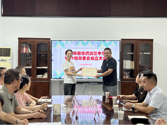 会议锚定制度根基,年级组王海燕解读《黄山市田家炳实验中学家长委员会工作条例》,明确家委会“群众性自治组织”定位;党支部组织委员、校办主任崔仲文结合《家长委员会工作职责》细化职责清单,聚焦校服征订、矛盾调解等民生关切。现场颁发聘书仪式庄重,一纸聘书承载信任与责任,架起家校“连心桥”。