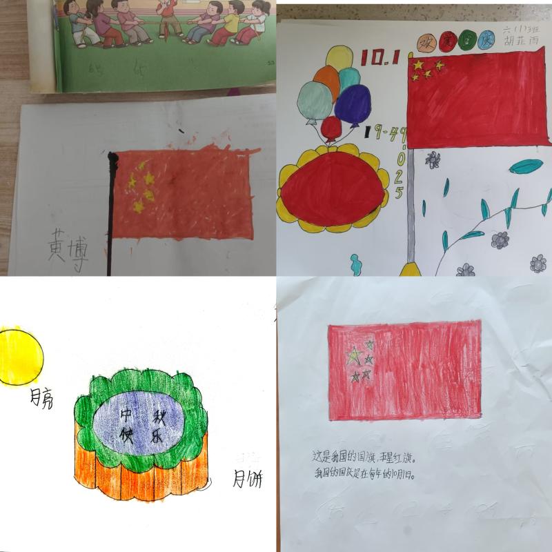 低年级学生以“亲子互动”为核心,开启节日探索之旅。他们在家长的陪伴下,完成“我给国旗画星星”“我帮家人摆月亮桌”等趣味任务:一笔一画勾勒国旗上的五角星,感受国旗的庄严与神圣;主动摆放中秋家宴的碗筷、整理餐桌,在动手过程中触摸“团圆”的意义,亲子间的互动让节日氛围愈发浓厚。