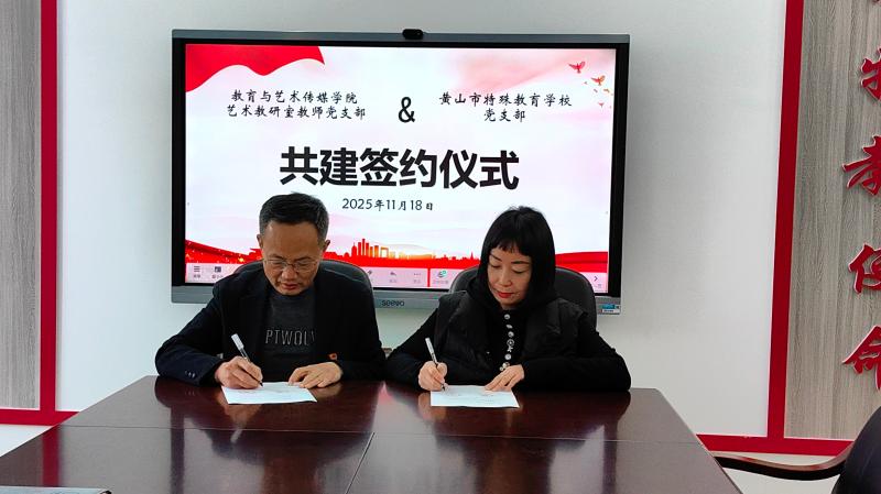 为深入贯彻落实“共建共育、协同育人”理念,探索党建与教育教学深度融合新路径,2025年11月18日,黄山市特殊教育学校与黄山职业技术学院教育与艺术传媒学院艺术教研室教师党支部共建活动在黄山市特殊教育学校成功举行。本次活动以“导-师-制+”为核心载体,旨在通过党建引领,推动特殊教育与艺术教育的深度交融,实现资源共享、优势互补、协同发展。