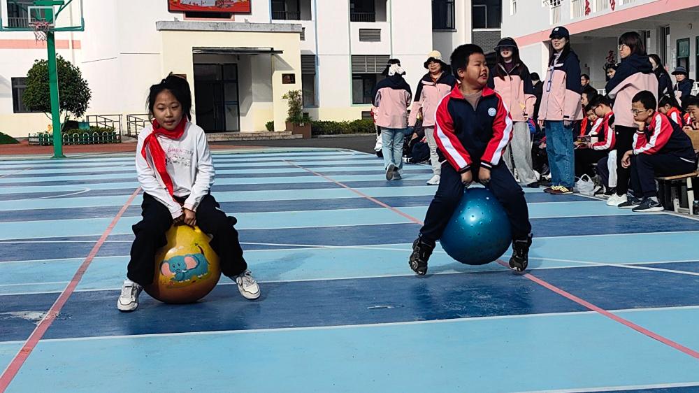 学生个人项目根据低年级、中年级、高年级学生的身心发展特点,既设置相同的项目直观展现学生的能力提升情况,又根据学段特点量身定制了各具特色的项目增强趣味性。低年级组孩子活力满满,严阵以待,在投沙包项目中瞄准目标、奋力投掷,小小沙包承载着他们的专注与勇气;骑羊角球时,孩子们双腿夹紧球身,双手紧握把手,在赛道上蹦跳前行,脸上洋溢着天真烂漫的笑容……