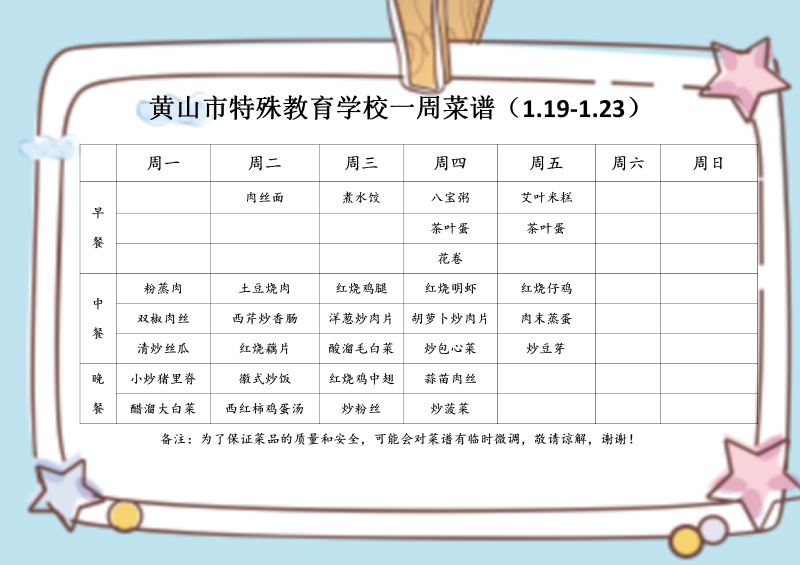黄山市特殊教育学校一周菜谱(1.19-1.23)