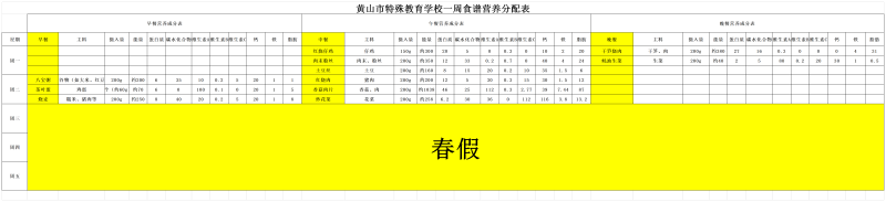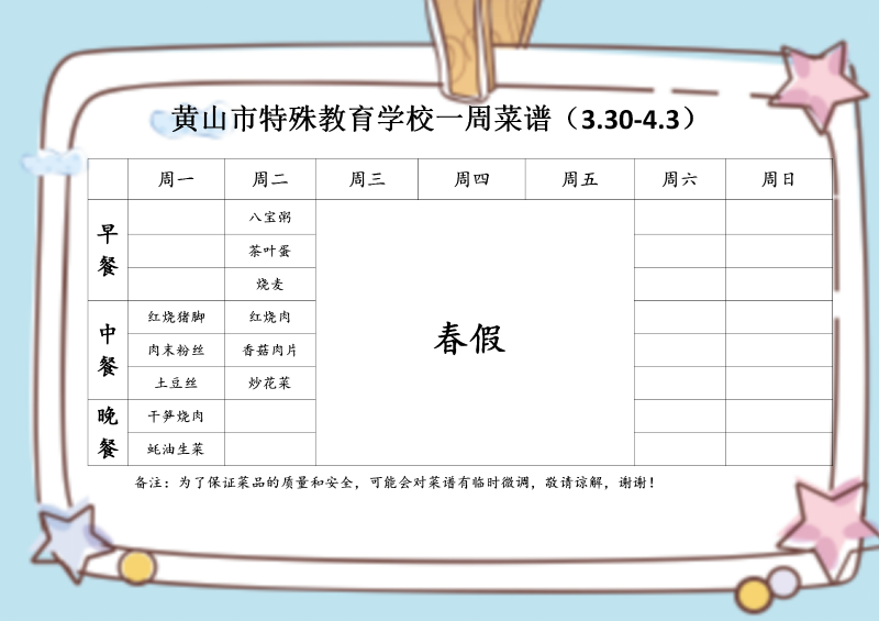 黄山市特殊教育学校一周菜谱(3.30-4.3)