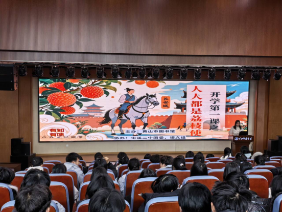 春启新程,书香润心。为丰富校园文化生活,引导学子汲取奋进力量,筑牢新学期成长根基,3月4日下午,屯溪二中团委携手语文教研组,联合黄山市图书馆,依托其“有知有味”文化品牌,以热门作品《长安的荔枝》为载体,为全校学子呈现了一堂别开生面、直击心灵的开学第一课。