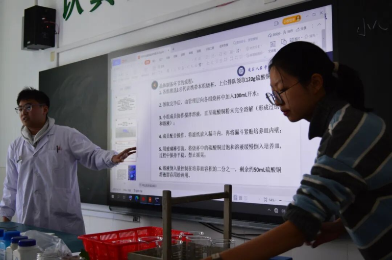 在实验中,社员们以小组为单位,开启实验关键环节。从配制硫酸铜溶液、过滤提纯,到制备热饱和溶液并培育晶体,每个步骤都在团队协作中有序推进。实验室内器材整齐排列,大家在规范操作中扎实掌握实验技能,深刻体会化学实验的严谨性,逐步达成预设的实验目标。
