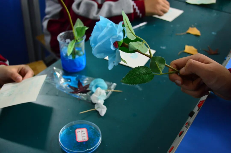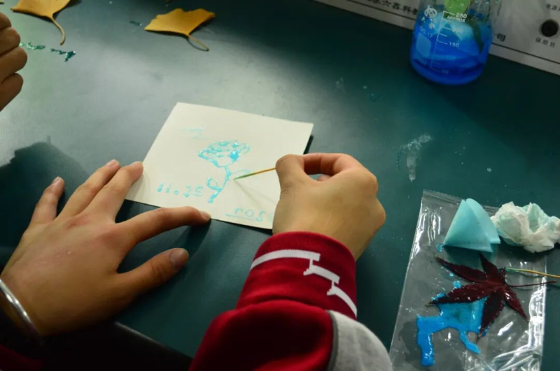 实验后半段,社员们开启“创意模式”,用硫酸铜溶液绘画、借助模具制作玫瑰摆件与创意饰品。科学原理与艺术创意碰撞融合,既丰富了实验实践形式,更充分激发大家对化学实验的兴趣,让实验目的在创意实践中进一步落地。