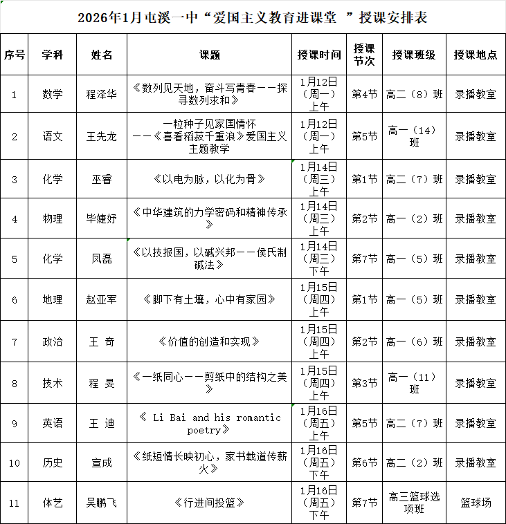 为深化“导-师-制+”育人模式创新,落实立德树人根本任务,推动爱国主义教育与学科教学深度融合,2026 年1月12日至16日,屯溪一中开展“爱国主义教育进课堂”教学周活动。活动覆盖 11 个学科教研组,授课教师以学科为载体、以爱国为内核,打造出一堂堂有温度、有深度、有特色的育人课堂,让爱国种子在菁菁校园生根发芽、蓄力生长。