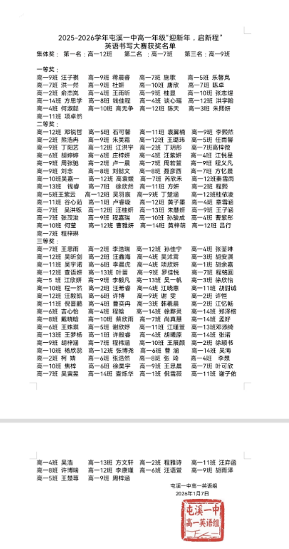 岁聿云暮,新元肇启。为深入践行“导-师-制+”育人理念,发挥同伴导师作用,激发学生英语学习兴趣,提高学生英语书写水平,屯溪一中高一年级举办“迎新年,启新程”英语书写大赛。本次大赛旨在通过书写这一基础技能的锤炼,培养学生良好的英语学习习惯,提升学生综合素质,同时为学生搭建展示自我风采的平台。