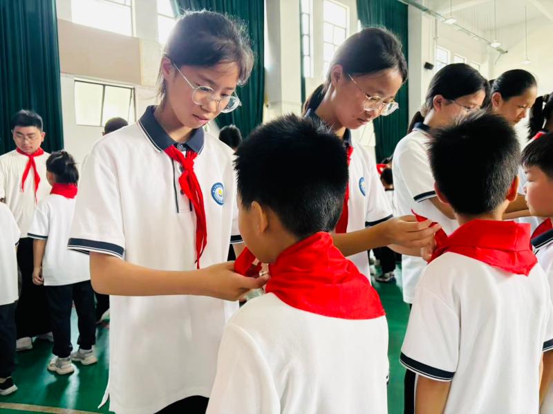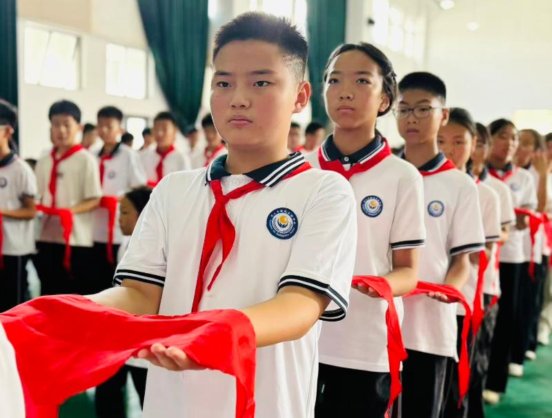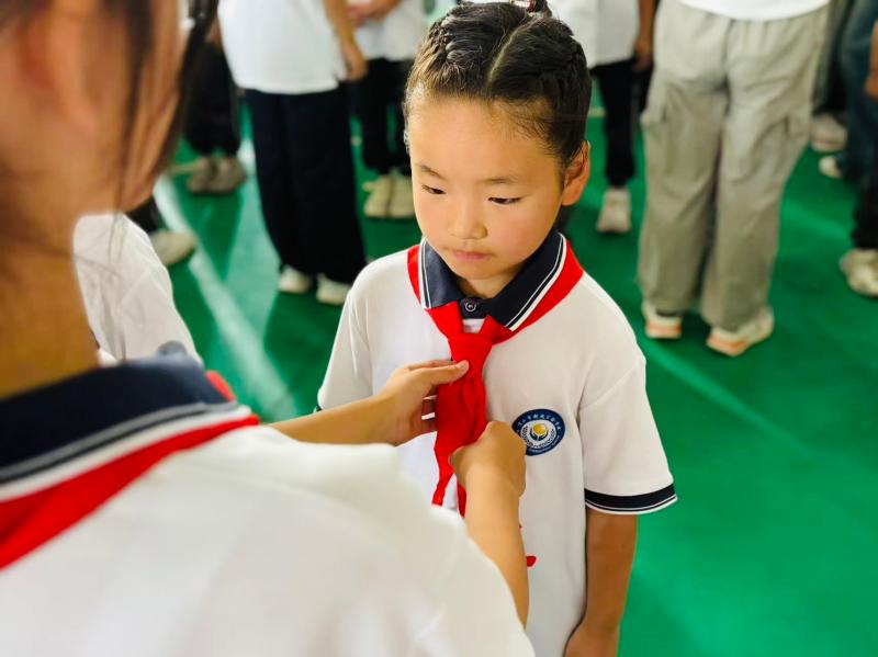 火红的队旗,引领我们奋步向前。在星星火炬的照耀下,184名新队员光荣加入中国少年先锋队。七年级的队员们为二年级新队员佩戴上鲜艳的红领巾。红领巾飘扬在胸前,象征着责任的传承与理想的接力。