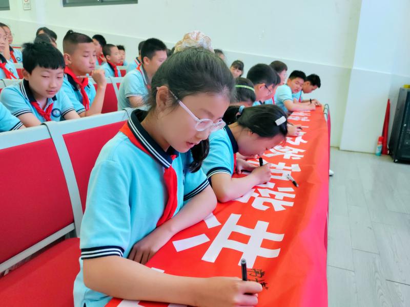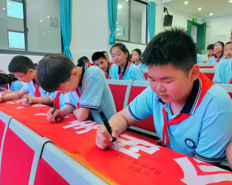 活动伊始,德育处主任杨涛作动员讲话。他对世界地球日的来源、诞生及发展作了详细地介绍。强调了地球只有一个,“珍爱地球,保护环境”迫在眉睫!动员大会后,少先队员们便拿起手中的笔在横幅上郑重签名。