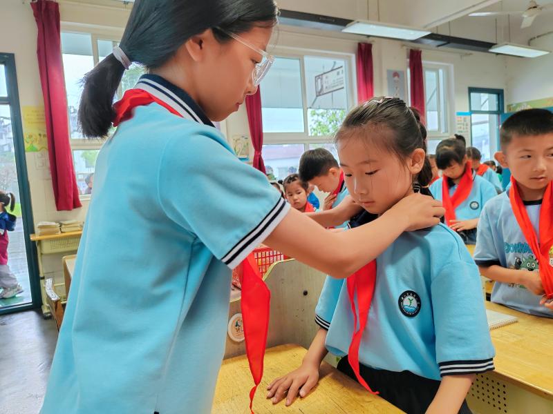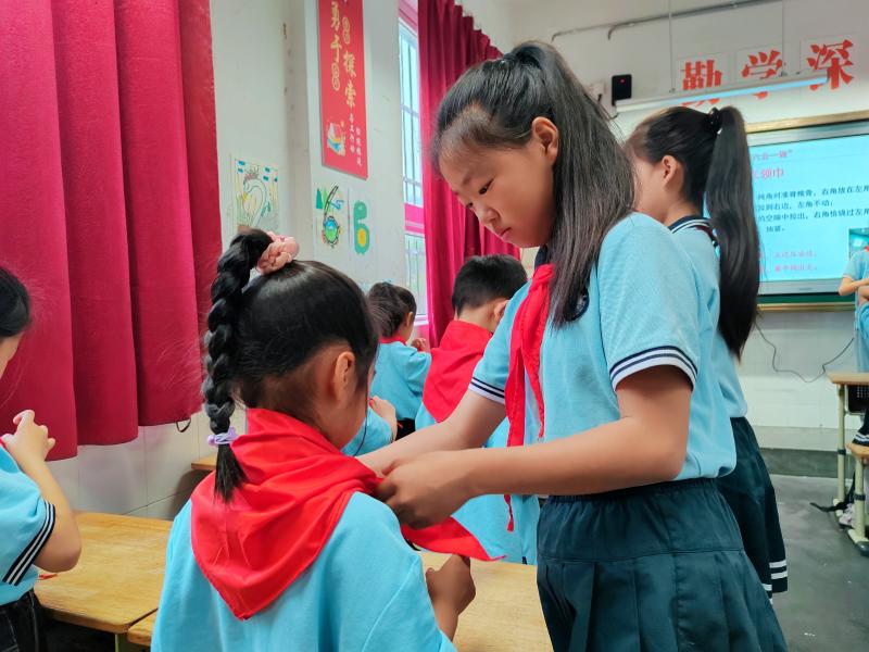 瞧,辅导员老师和哥哥姐姐们在教小队员们学习如何佩戴红领巾。望着胸前的这抹红色,他们是多么骄傲和自豪!