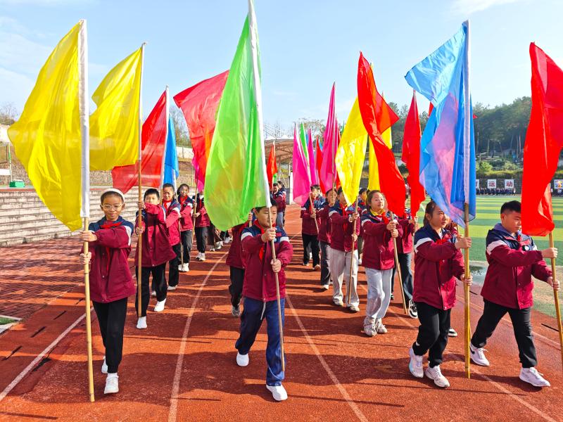 彩旗队紧随其后,五彩斑斓的旗帜在队员手中挥舞,如流动的彩虹穿梭赛场,象征着校园生活的多彩与活力。