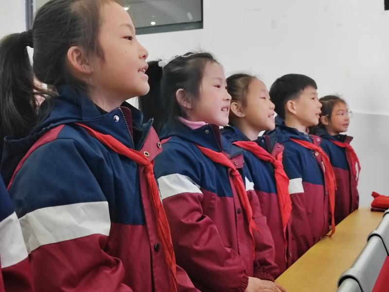 随着嘹亮的《出旗曲》,三名旗手高举队旗、昂首挺胸向我们走来。由周菁菁老师指挥全体代表齐唱《中国少年先锋队队歌》,表达自己对对少先队组织的忠诚与热爱,以及争做新时代中国特色社会主义合格接班人的决心。