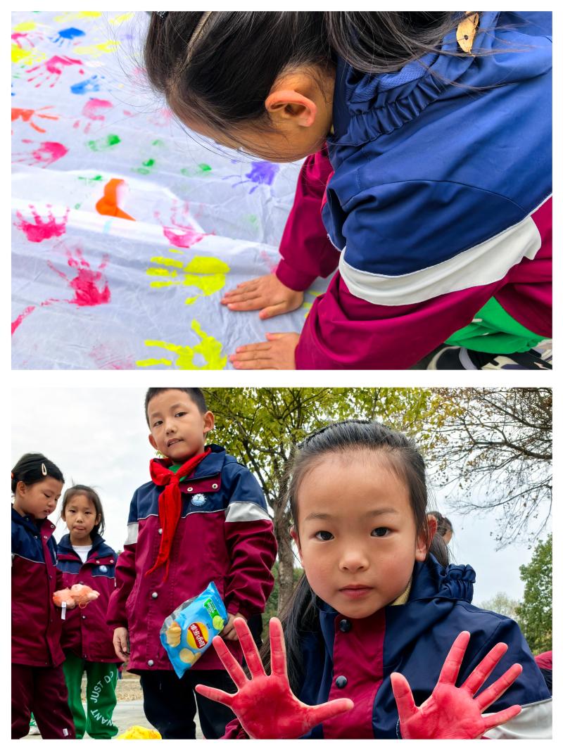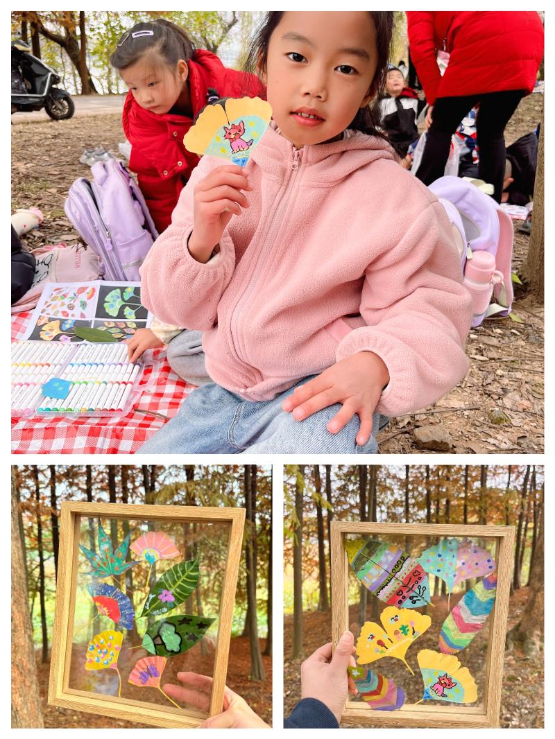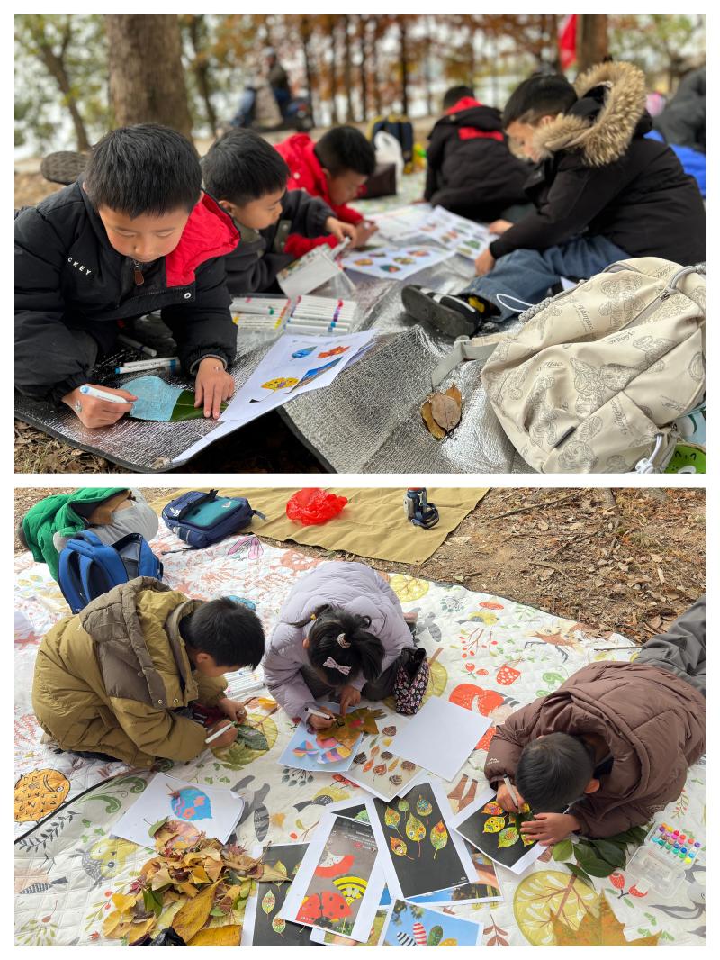 一年级队员们以大地为舞台,以落叶为画纸,用好奇而专注的目光,轻轻拾起形状各异的梧桐叶、银杏叶和枫叶,再以鲜亮的色彩,在叶面上描绘出彩色的脉络、微笑的果实、圆圆的眼睛和他们心中最有趣的童话。