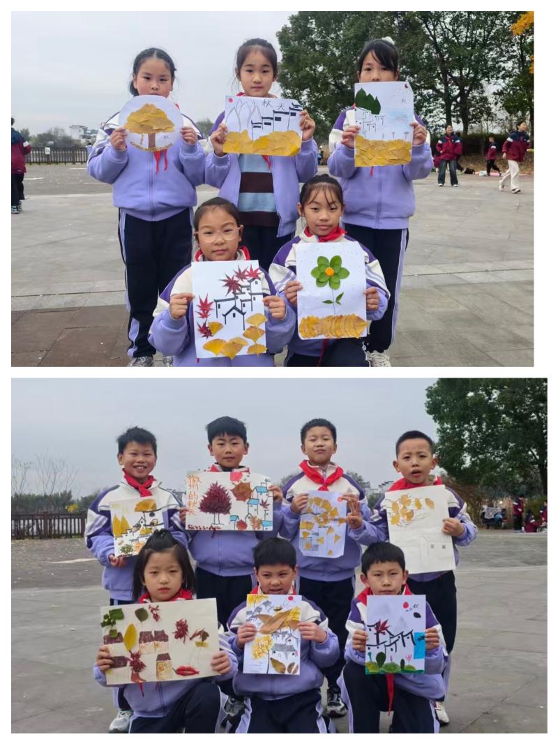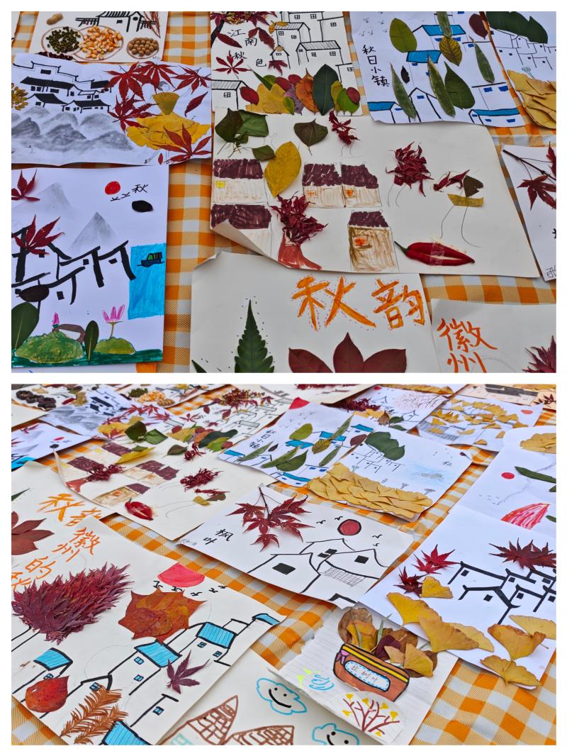 秋风送爽,落叶翩跹。三年级中队的队员们化身“秋日拾叶人”,走进自然捡拾形态各异的落叶。他们以叶为笔、以秋为墨,将红枫、银杏、梧桐叶等巧妙拼接,勾勒出粉墙黛瓦、小桥流水的徽州秋景。一片片落叶在孩子们的巧手中焕发新生,既定格了秋日美好,也展现了对传统文化的喜爱与创造力。