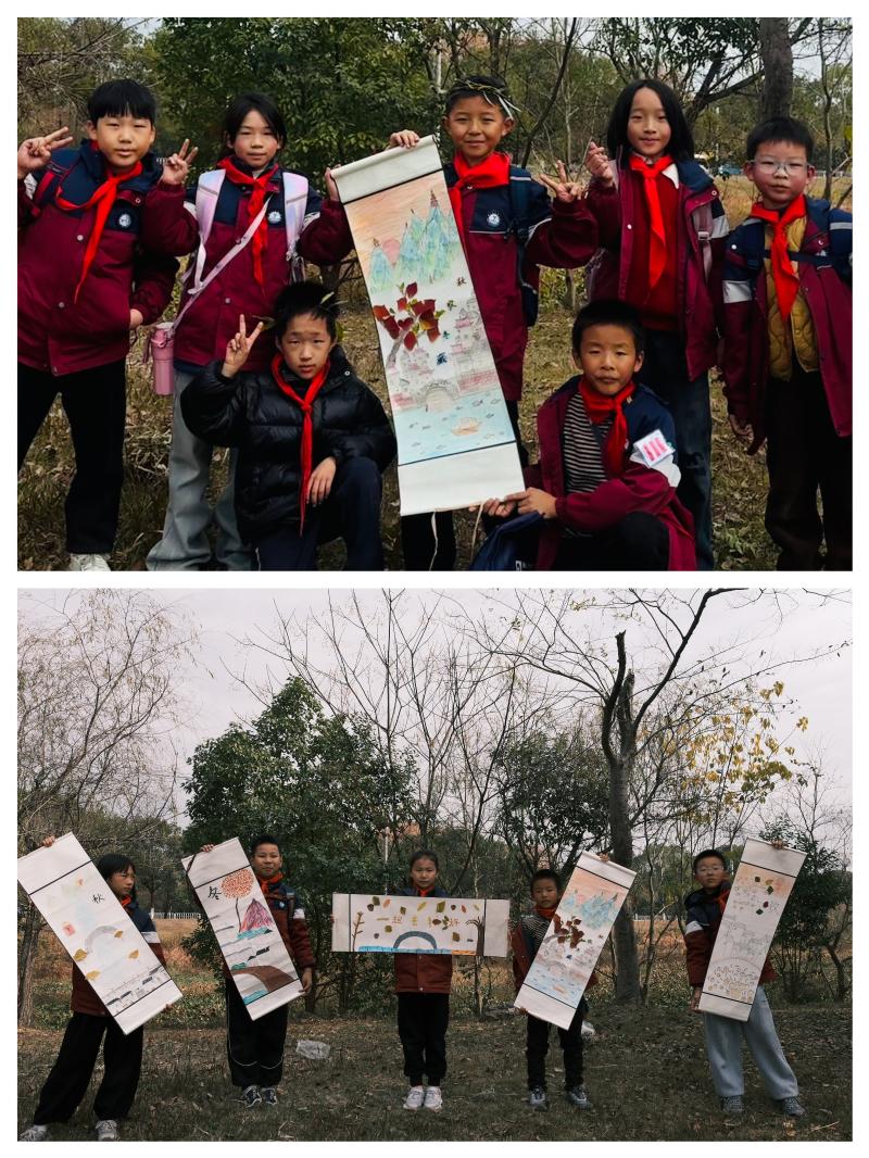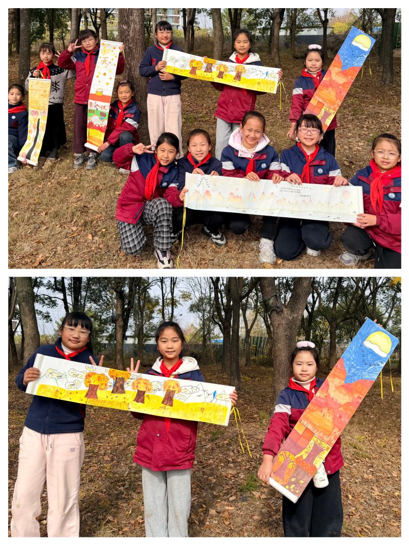 四年级队员们在老师的带领下,在湿地公园铺开长长的画卷,开展“秋染湿地·共绘家乡”活动。在师生共同协作下完成绘画长卷,用童真画笔勾勒芦苇、湖水、候鸟等秋景,在赏秋创作中培养了队员们爱自然、护家乡的美好情感。