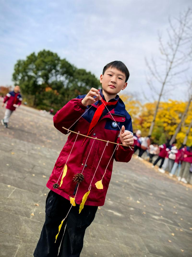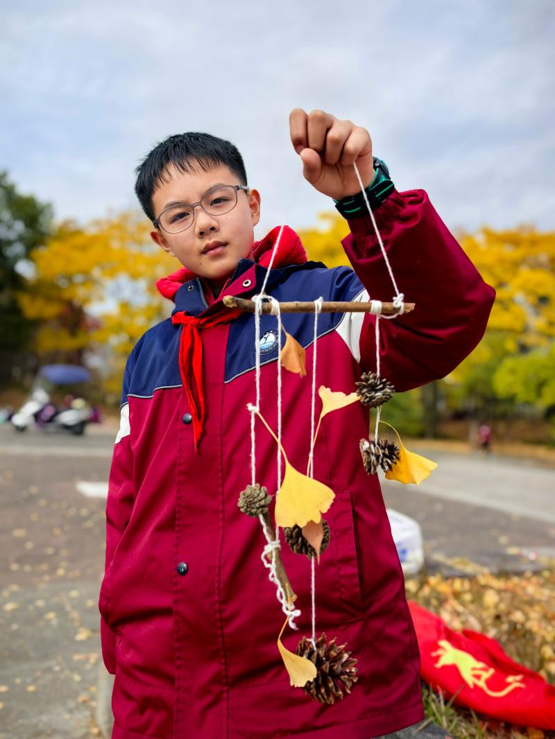 六年级的少年们以秋风为信使,以落叶为音符,带着巧思与创意,细心捡拾纹路清晰的香樟叶、柔韧的桂叶和形似小扇的梧桐叶。他们用彩绳穿起叶片,搭配松果、橡果,又用马克笔在叶面上勾勒出星辰、飞鸟与成长的心愿,将一片片落叶化作灵动的风铃。当微风拂过,叶片轻摇,清脆的叮当声混着少年们的笑语,在草地上漾开,每一声铃响,都是他们用自然之美编织的青春序曲。