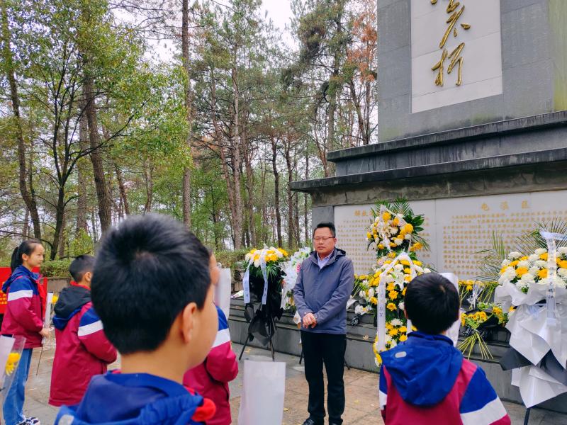 党支部专职副书记李均为队员们讲述革命先烈的英勇事迹,一段段可歌可泣的历史,一个个感人至深的故事,让队员们深刻感受到革命先辈们不畏艰险、不怕牺牲、无私奉献的崇高精神。随后,队员们有序绕行烈士纪念碑,亲手将鲜花敬献在墓碑前。