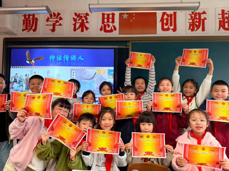 当“最佳传讲小组”“创意演绎之星”“最具感染力”等奖状送到孩子们手中时,一张张笑脸格外耀眼。此次活动既是语文单元学习的生动延伸,更让孩子们在合作与表达中爱上神话、读懂神话,成为传统文化的小小传承人。相信这些闪耀着智慧与勇气的神话故事,会在他们心中种下文化自信的种子,伴随成长一路生花!