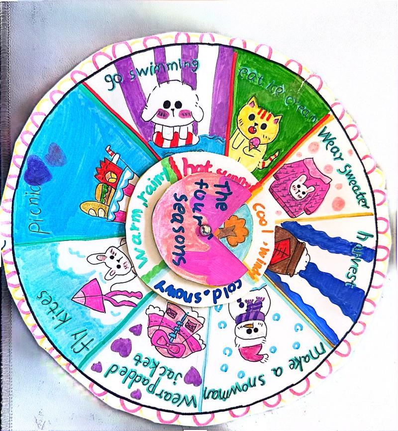 在吴老师的引导下,同学们化身同伴导师,同伴合作,从“四季认知”出发,围绕“季节名称、气候特点、趣味活动”三大核心板块展开创作。大家精心挑选彩纸、画笔、转轴等材料,先在转盘上清晰标注spring、summer、autumn、winter四个季节,再用简洁地道的英文写下对应气候和特色活动,辅以手绘的太阳、落叶、雪花等童趣图案,一个个色彩鲜艳、内容丰富的英文转盘就此诞生。