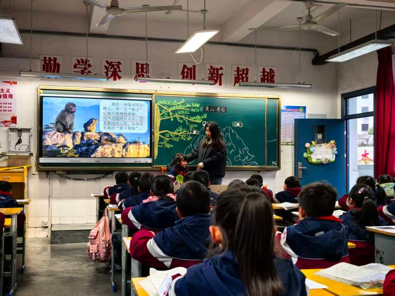 第一节课由董建莹老师执教《黄山奇石》。课堂上,董老师巧妙融入AI技术,创设“推选优秀旅行家”的趣味情境,以情境驱动学习,引导学生聚焦文本细节展开细读。在生动的互动与探究中,学生不仅深切感受了黄山奇石的奇特与壮美,更激发了对家乡文化的认同感与热爱之情,实现了语文工具性与人文性的统一。