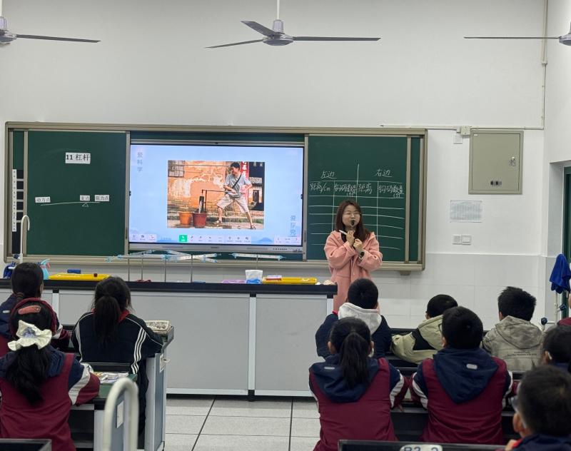 课堂伊始,易欢老师以二年级学习过的《朱德的扁担》作跨学科情境导入,瞬间点燃学生的探究热情,为破解“杠杆要素”“省力与费力杠杆的规律”等教学重难点做好铺垫。