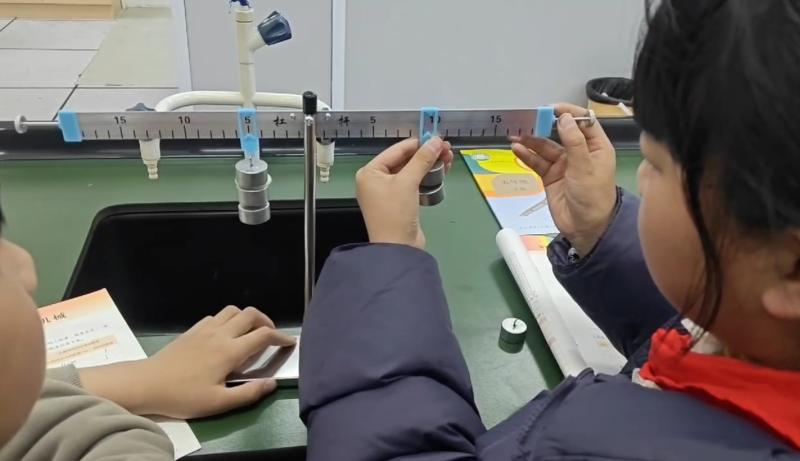 课堂上,学生分为若干探究小组,每组推选科学素养扎实、动手能力强的学生担任“小导师”。这些小导师在总导师的统筹指导下,提前参与备课,熟悉杠杆尺、钩码等实验器材的使用方法,梳理“探究杠杆平衡条件”的实验步骤。实验探究环节,小导师率先带领组员明确分工,从杠杆尺的组装、钩码的悬挂位置,到实验数据的记录、故障问题的排查,逐一进行示范讲解;总导师则穿梭于各小组之间,针对学生操作中出现的“支点找不准”“钩码悬挂不平衡”“数据记录混乱”等问题进行针对性点拨,形成“教师引领、同伴互助”的教学闭环。