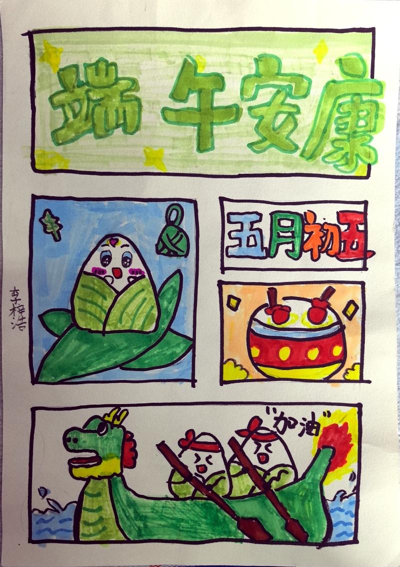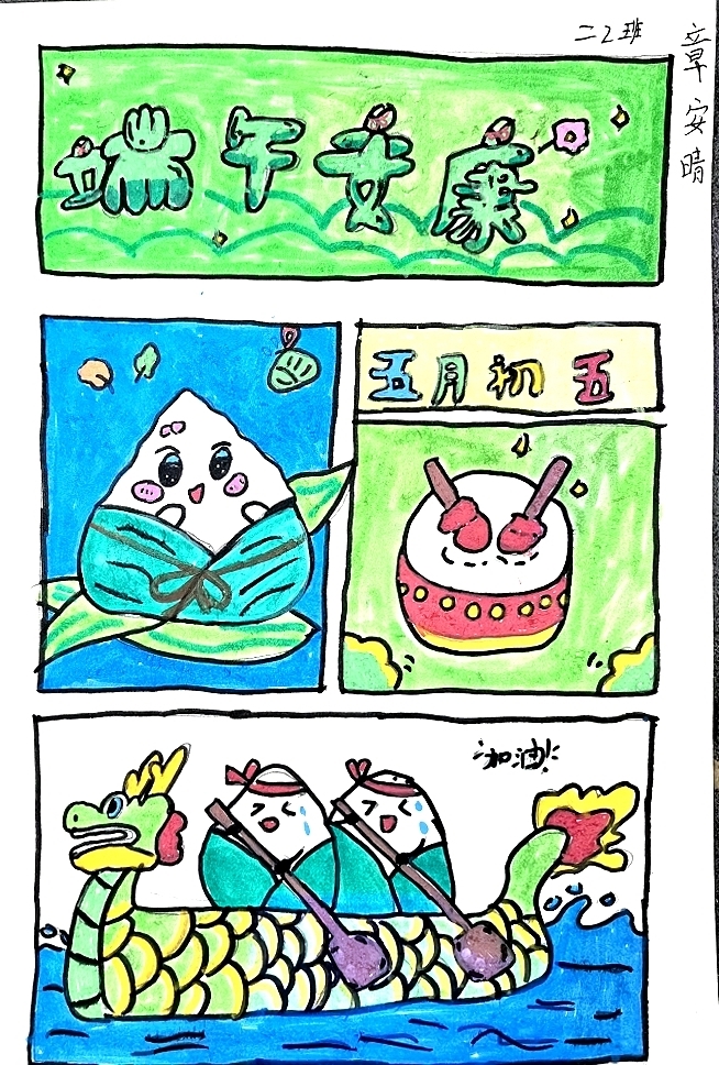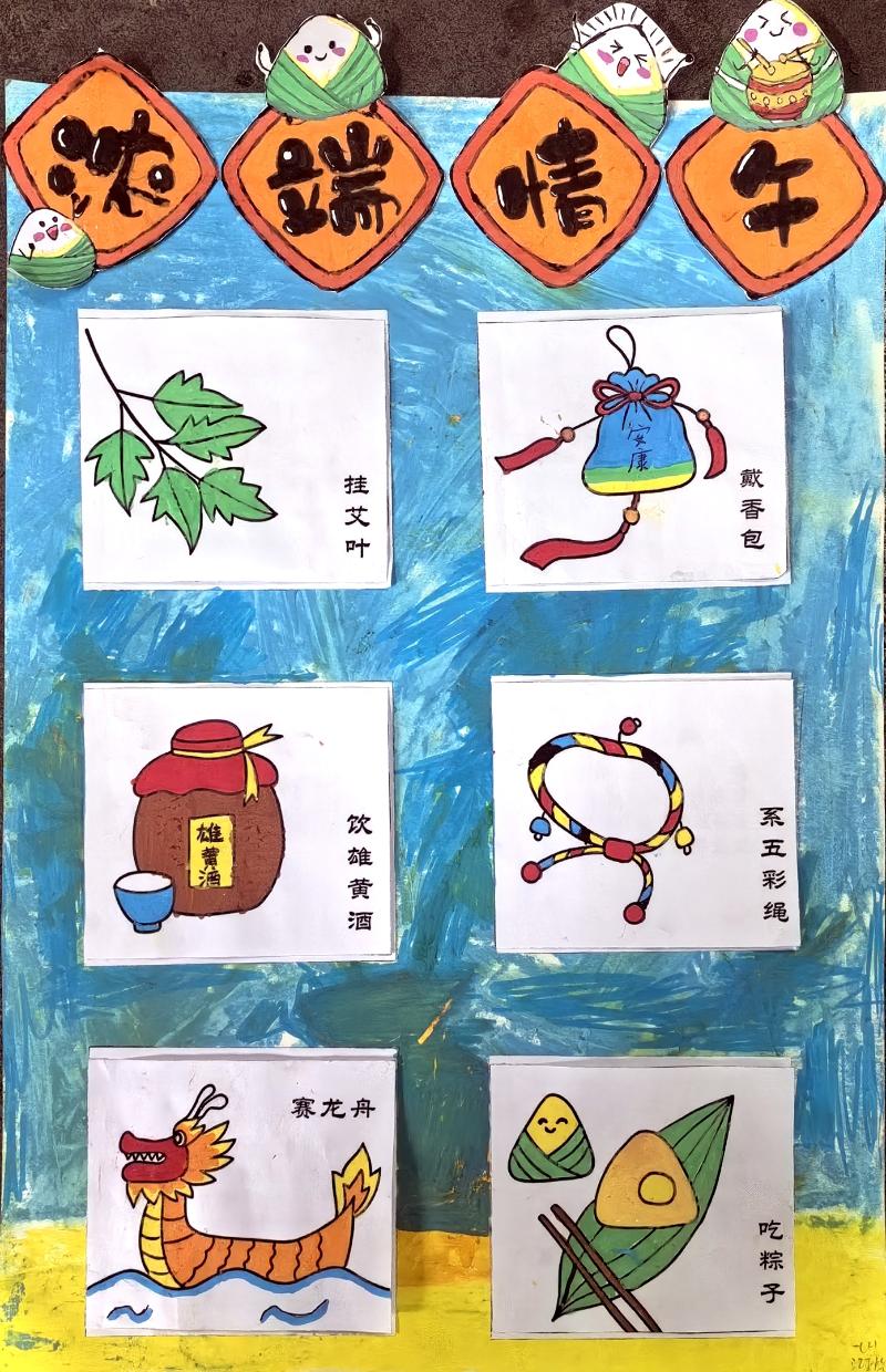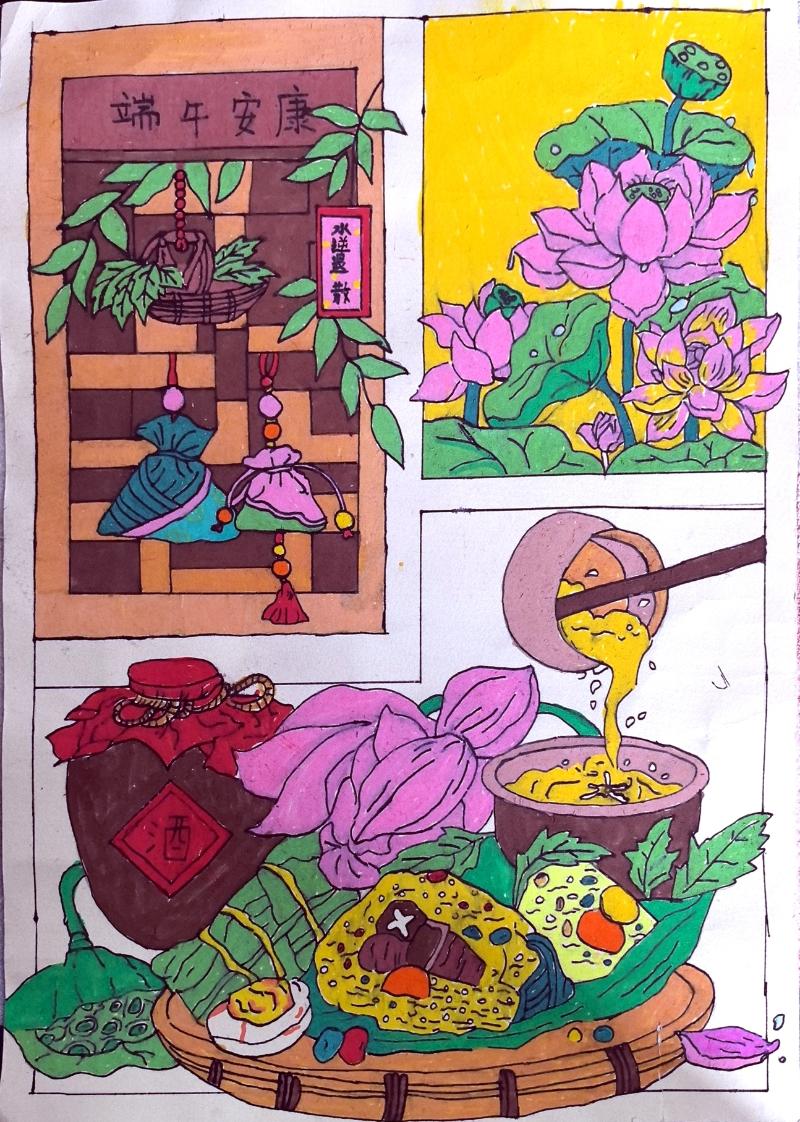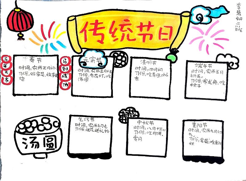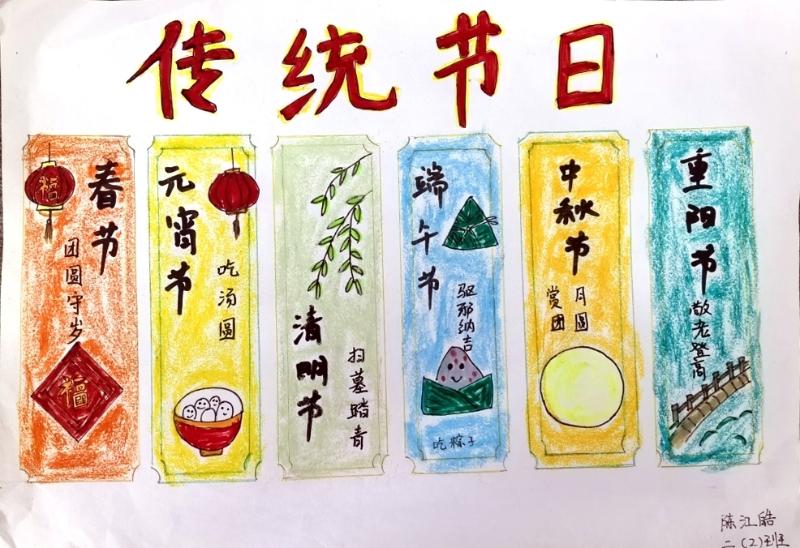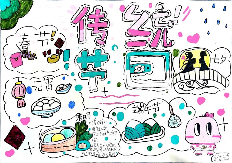 一幅幅色彩明快、创意十足的手抄报与绘画作品,版面精巧、内容丰富:既有春节、端午、中秋等传统节日的习俗展示,也有《清明》等经典古诗的图文演绎,更有传统祥瑞纹样的童趣呈现。文字工整清秀,画面活泼生动,尽显童真童趣与巧妙构思。