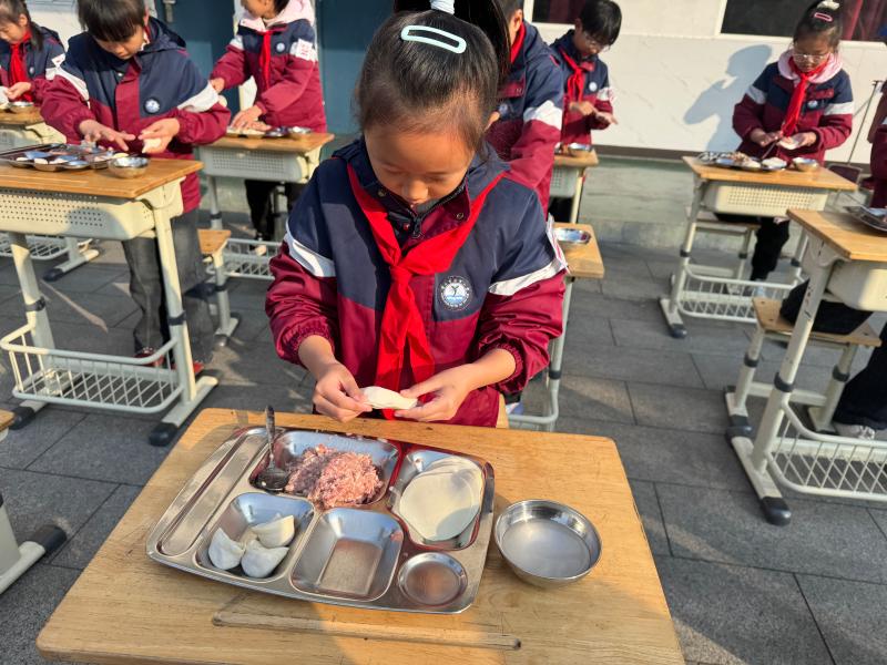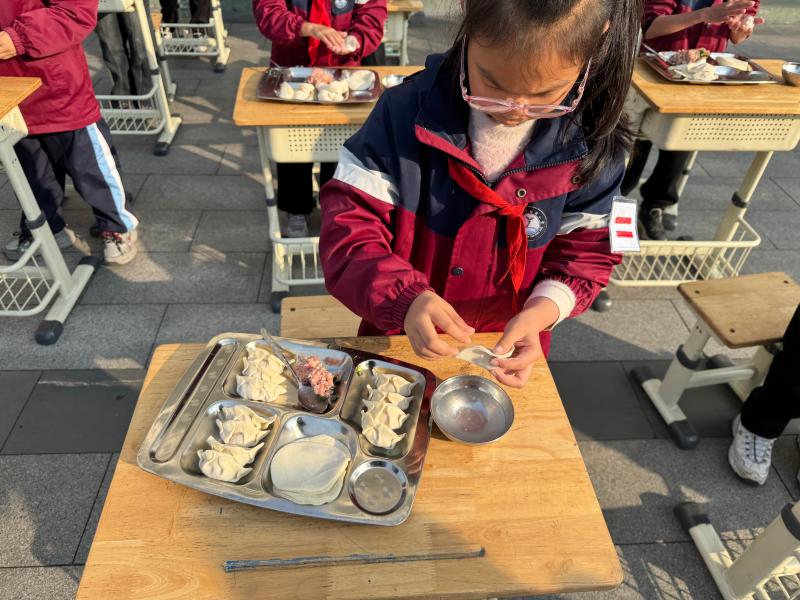 中年级的包饺子赛场热闹非凡。同学们化身“小小美食家”,填馅、捏边,动作有模有样。不一会儿,形态各异的饺子摆满托盘,浓浓的香气与欢声笑语弥漫赛场。