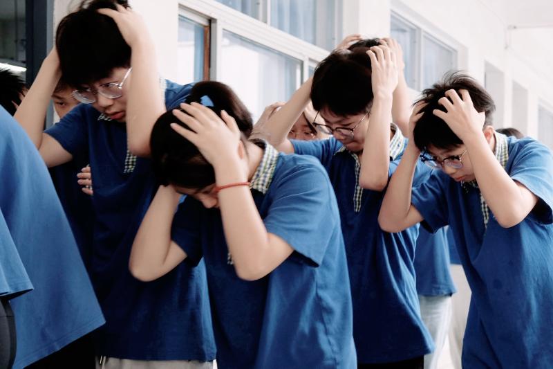 随着防空警报声划破校园上空,演练正式开始。各班主任和任课教师迅速引导学生按照预定路线有序撤离。学生们双手抱头、弯腰俯身,快速有序地从教室向指定安全区域疏散。到达集合点后,班主任立即清点人数并逐级上报。从警报拉响到全员集结完毕,整个过程井然有序、师生反应迅速、疏散路线清楚、组织有条不紊。