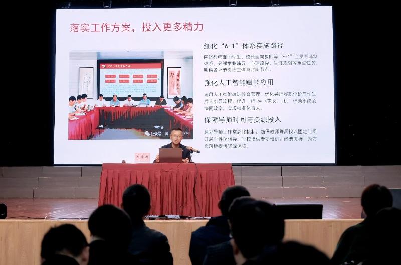 校长助理、高中部主任汪益军以《全面推行“导-师-制+”,助力黄山学校高质量发展》为题作了汇报。他系统阐释了“导-师-制+”的“6+1”体系架构,即构建校长面向教师、教师面向学生、教师面向家长、家长面向学生、社会面向学校、学生面向学生的互动育人网络,并以人工智能作为核心赋能育人系统。汇报紧扣教育高质量发展的根本动力与标准,详细解读了方案的指导思想、组织架构、导师职责、评价机制及本学期具体工作安排,为学校全面推行导师制提供了清晰的行动路线图。