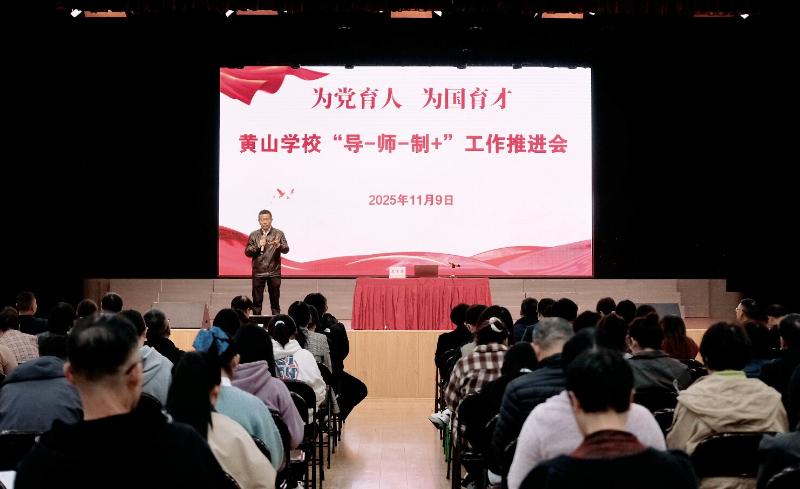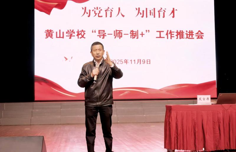 2025年11月9日晚,黄山学校“导-师-制+”工作推进会在行知剧院隆重召开。会议由学校党支部书记、执行校长洪宝宝主持,校长助理、高中部主任汪益军解读学校方案,市委社会工作部、市委非公党建指导员任俊斌作指导。全体教职工参加会议。