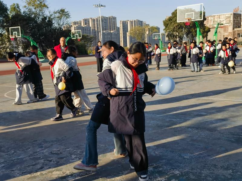 冬日的暖阳洒满欢腾的操场,一场“运气球大赛”在这里正如火如荼进行!孩子们两两一组,背靠着背,手勾住手,圆鼓鼓的气球被小心翼翼地夹在中间。“一二一,一二一!”伴着清脆的口号,他们迈开统一的步伐,像一队笨拙又可爱的企鹅,齐心协力冲向终点。欢笑声与加油声交织,小小的气球,传递着大大的默契与欢乐。