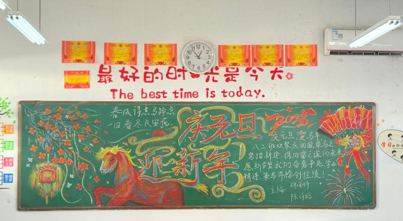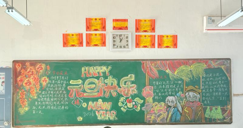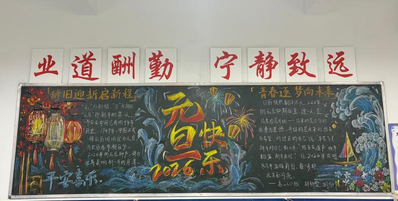 活动启动后,各班级高度重视,师生共同构思策划。从排版设计的创意打磨,到图文内容的精心筛选,同学们紧扣活动主题,将对新年的美好期许、对青春的奋进追求与校园生活实际相结合,让每一块黑板报都成为展现班级风貌的独特载体。有的班级以灵动的插画展现辞旧迎新的喜庆场景,有的班级用工整的文字书写逐梦未来的励志话语......字迹端正、色彩鲜艳的板报作品,不仅彰显了同学们的艺术才华,更凝聚了班集体的协作力量。各班班主任全程指导,学生们分工协作、默契配合,在黑板上勾勒线条、填充色彩,让创意与灵感在校园里绽放。