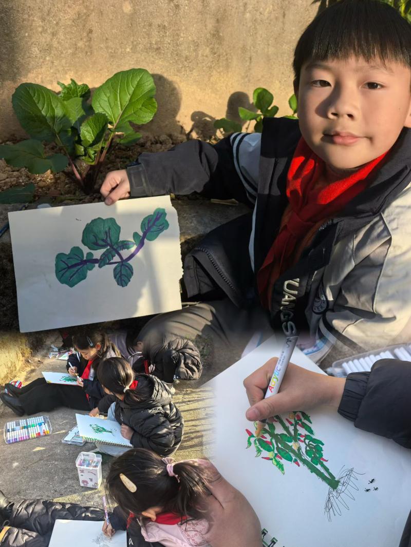 “看,这棵菜的茎是紫色的!”“辣椒已经红啦!”……孩子们不仅悉心照料着蔬菜,还用画笔为它们创作“生长日记”,导师们则在一旁耐心引导,帮他们记录下生命的细微变化。一涂一抹、一记一录之间,劳动教育与美育在此自然融合,孩子们在观察中读懂生命,在创作中收藏成长,而导师的陪伴与引导,让每一份观察都更有温度、每一份记录都更有意义。